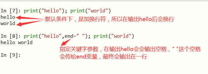 除了位置对应外,还有一种使用关键字的对应方法,说的直白点,就是在调用时,可以用凑字字指定把这个参数传递给以关键字命名的这个变量,在交互式shell中实践一下print()函数(print中的关键字参数end指定在输出字符串后,需要在此行末尾加的字符,默认是加换行符):