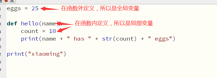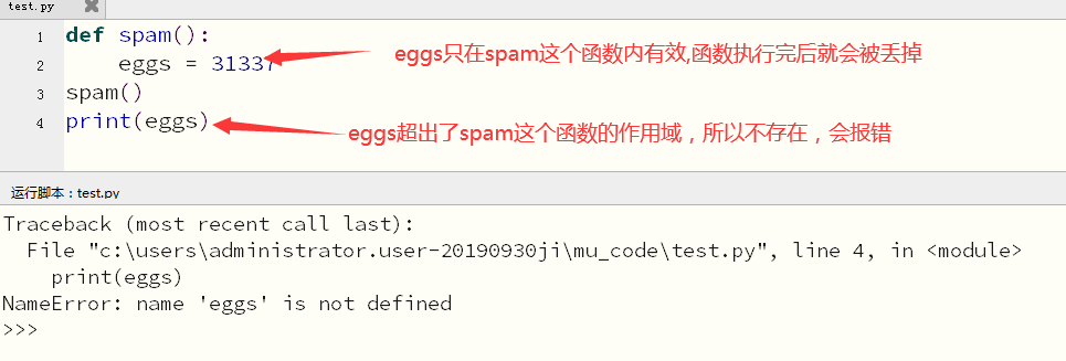 print(eggs) # 这是在全局作用域内,所以所有的局部作用里的变量都不存在了,所以会使用全局变量eggs