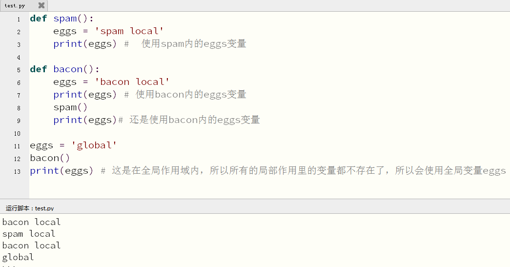 在spam函数内并没有变量eggs,但可以正确的输出结果,因为在全局作用域内有一个叫eggs的变量。