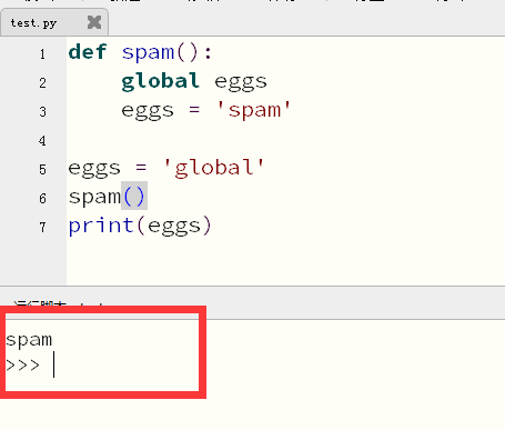 那如果我不想在spam函数内新创建一个叫eggs的变量呢,我只想在这个函数内使用全局变量eggs呢,好办,使用global关键字,如下: