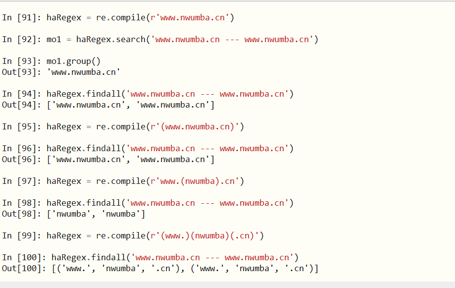 search()方法只会返回第一个匹配的文本,而findall()会返回一个列表,这个列表会包括所有匹配的文本,如果模式分组了,那么会返回一个包括元组的列表。